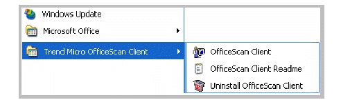 The Trend Micro OfficeScan client shortcuts appear on the Windows Start menu on the client computer.