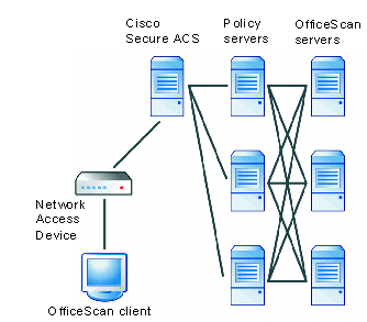 The Policy Server is responsible for evaluating the OfficeScan client’s security posture and for creating the posture token. It compares the security posture with the latest versions of the Virus Pattern and Virus Scan Engine received from the OfficeScan server to which the client is a member. It returns the posture token to the Cisco Secure ACS server, which in turn passes it to the client from the Cisco Network Access Device.