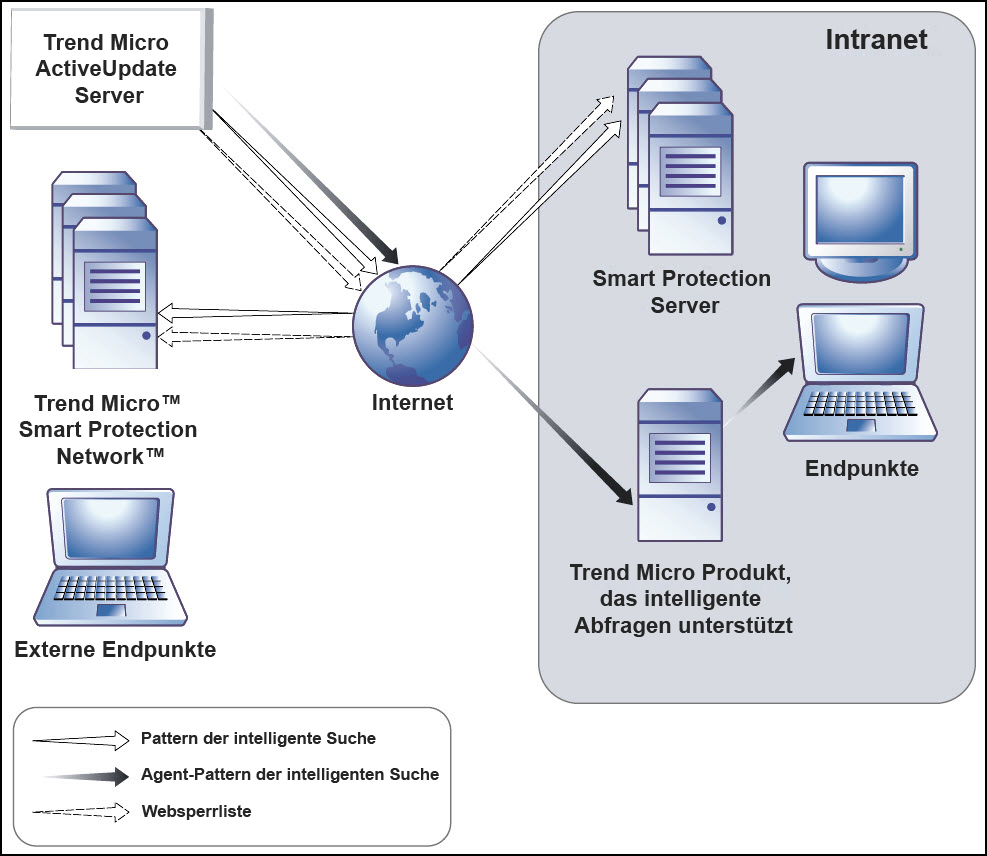 Endpunkte innerhalb Ihres Intranets laden die Agent-Pattern der intelligenten Suche von Trend Micro-Produkten herunter, die Smart Protection Server-Computer unterstützen. Externe Endpunkte sind Endpunkte außerhalb des Intranets, die keine Verbindung zu Smart Protection Server-Computern oder Trend Micro-Produkten haben, die Smart Protection Server-Computer unterstützen.