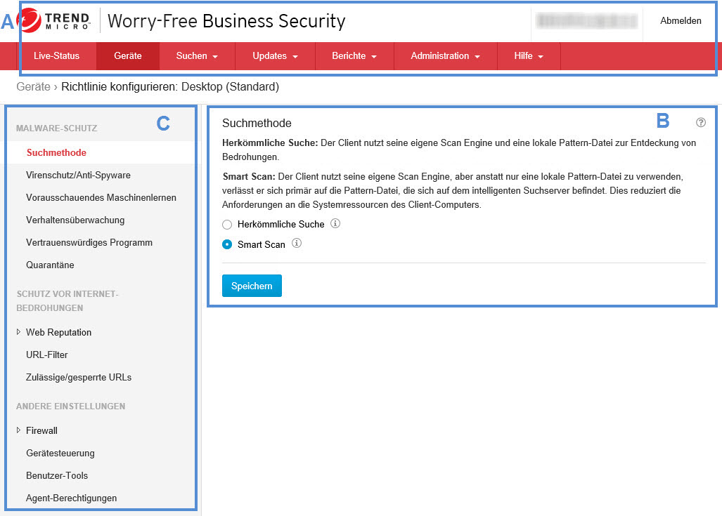 Wenn Sie eine Security Agent Gruppe im Fenster Geräte auswählen und anschließend auf Richtlinie konfigurieren klicken, wird ein Seitenmenü angezeigt. Verwenden Sie das Seitenmenü zur Konfiguration der Sicherheitseinstellungen und der Suchaktionen auf den Desktops und Servern der Gruppe. Bei Auswahl eines Messaging Security Agents im Fenster Geräte (nur Advanced) können Sie im Seitenmenü Sicherheitseinstellungen und Suchaktionen für Ihre Microsoft Exchange Server konfigurieren. |