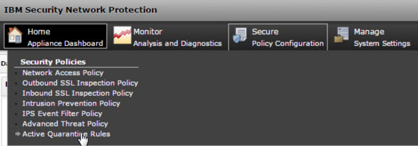 (Optional) On the IBM XGS console, go to Secure Policy Configuration > Security Policies > Active Quarantine Rules to view suspicious objects and C&C callback addresses sent by Deep Discovery Director (Consolidated Mode) to IBM XGS.