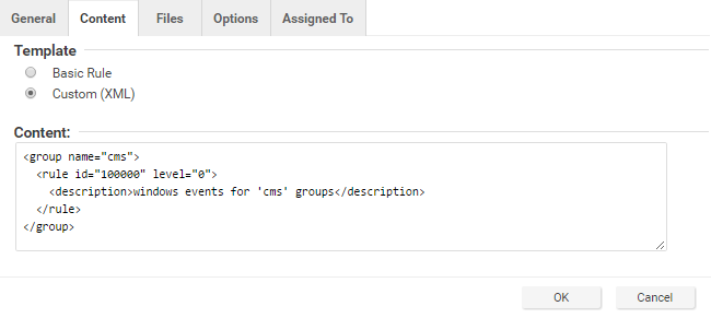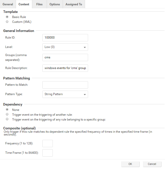 The Content tab is where you define the rule. The easiest way to define a rule is to select Basic Rule and use the options provided to define the rule. If you need further customization, you can select Custom (XML) to switch to an XML view of the rule that you are defining.Any changes you make in the Custom (XML) view will be lost if you switch back to the Basic Rule view.For further assistance in writing your own Log Inspection rules using the XML-based language, consult the OSSEC documentation or contact your support provider.These options are available for the Basic Rule template: