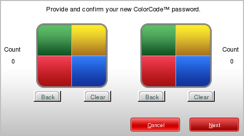 Click Back to change the last color clicked, or click Clear to start over. - After the sequence is complete, confirm the ColorCode password using the square to the right.