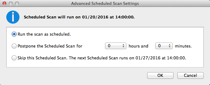If the Apex One (Mac) administrator grants you the privileges, you can allow, postpone, or skip a Scheduled Scan in the Advanced Scheduled Scan Settings screen.