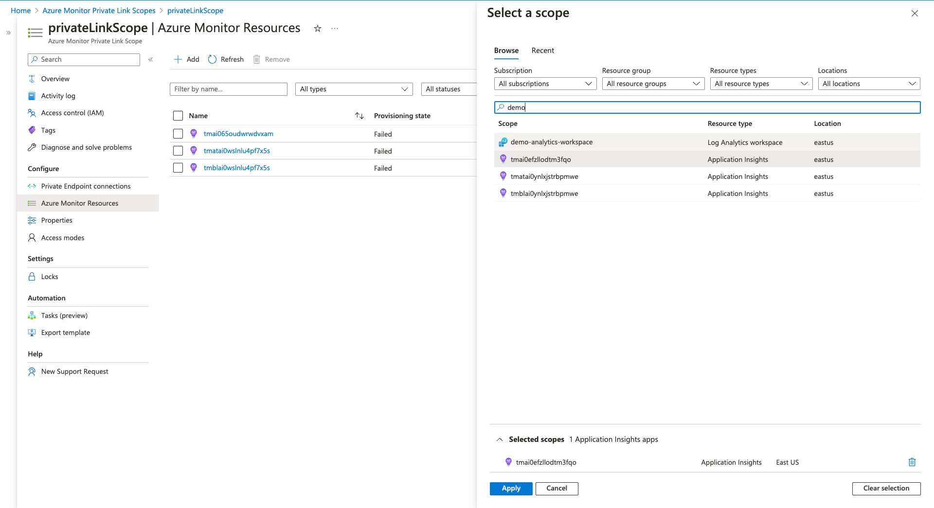 Azure Monitor Private Link Scope (AMPLS) and Application Insights. Failing to do so