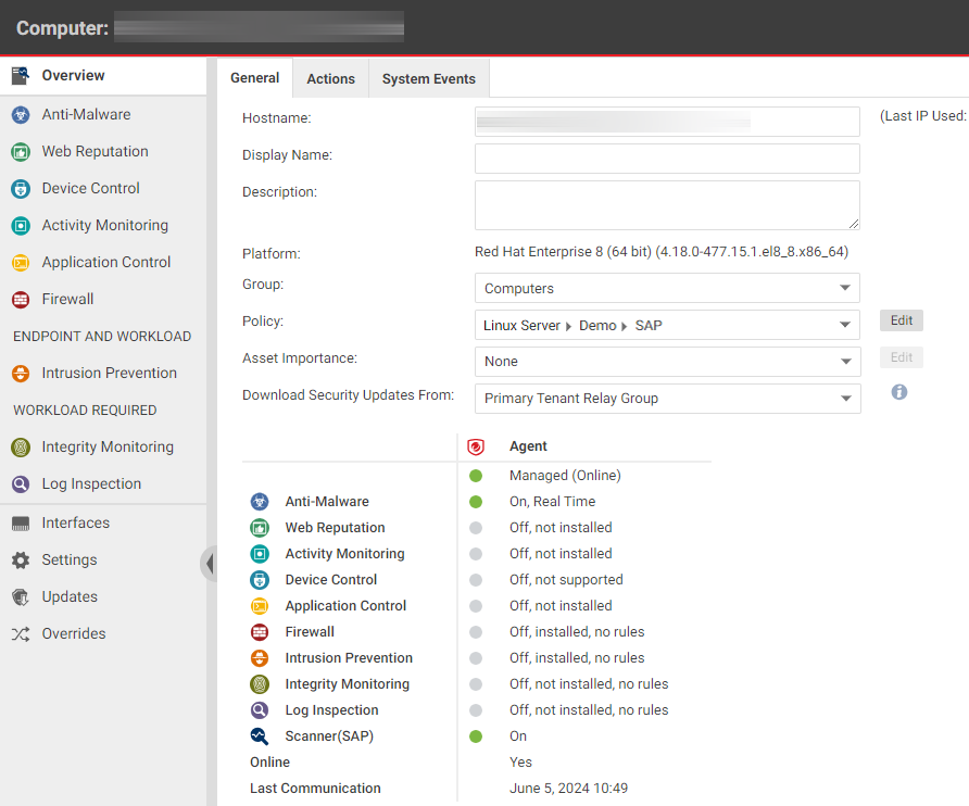 At this point, the status of the agent is Managed (Online), but there is no protection module installed. This means that the agent and Workload