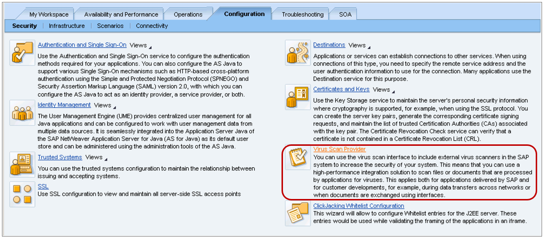 SAP NetWeaver: SAP integrated technology computing platform. The SAP NetWeaver Virus Scan Interface (NW-VSI) provides virus scanning capabilities for third-party products that perform the actual scan. The NW-VSI interface must be activated.