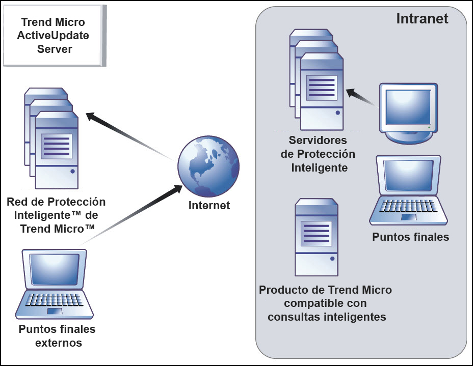 Los endpoints que haya actualmente en la intranet utilizan los equipos de Smart Protection Server para realizar consultas. Los endpoints que no estén actualmente en la intranet se pueden conectar a la Trend Micro Smart Protection Network para realizar consultas.
