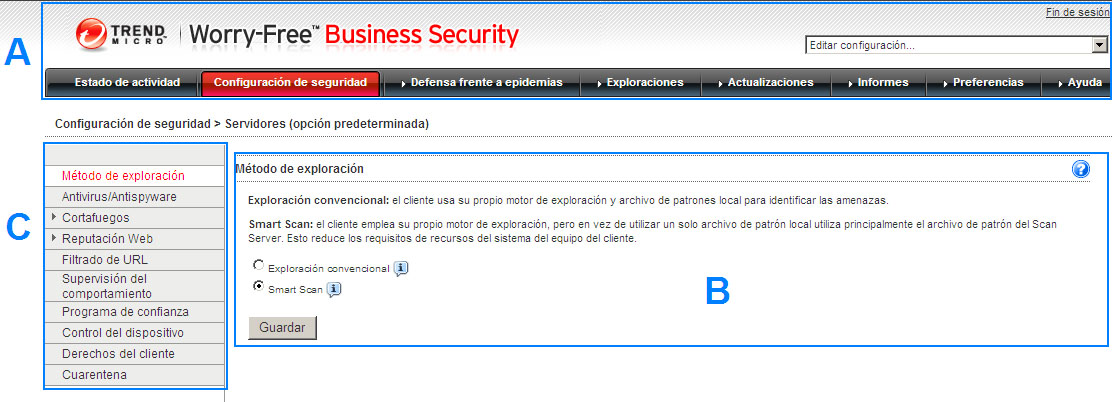 Cuando se selecciona un Messaging Security Agent en la pantalla Configuración de seguridad (Advanced solo), puede utilizar la barra lateral para definir la configuración de seguridad y las exploraciones de los servidores Microsoft Exchange.