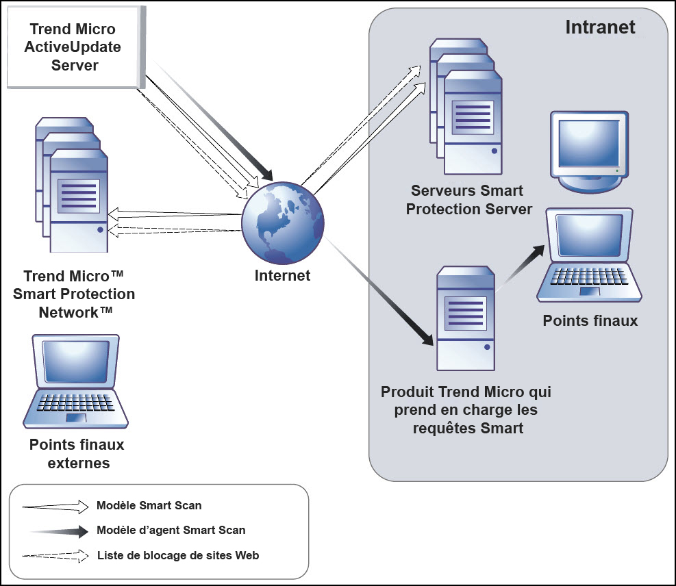 Les endpoints au sein de votre intranet téléchargent les fichiers Smart Scan Agent Pattern depuis les produits Trend Micro qui prennent en charge les ordinateurs Smart Protection Server. Les endpoints externes sont des endpoints situés hors de l'intranet et qui ne peuvent pas se connecter aux ordinateurs Smart Protection Server ou à des produits Trend Micro prenant en charge les ordinateurs Smart Protection Server.