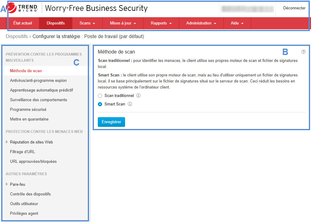 Lorsque vous choisissez un groupe d'agents Security Agent dans l'écran Dispositifs et que vous cliquez sur Configurer la stratégie, une barre de menus latérale s'affiche. Utilisez cette barre latérale pour configurer les paramètres de sécurité et les scans des postes de travail et des serveurs appartenant au groupe. Dans l'écran Dispositifs, lorsque vous choisissez un agent Messaging Security Agent (Advanced uniquement), vous pouvez utiliser la barre latérale pour configurer les paramètres de sécurité et les scans des serveurs Microsoft Exchange. |