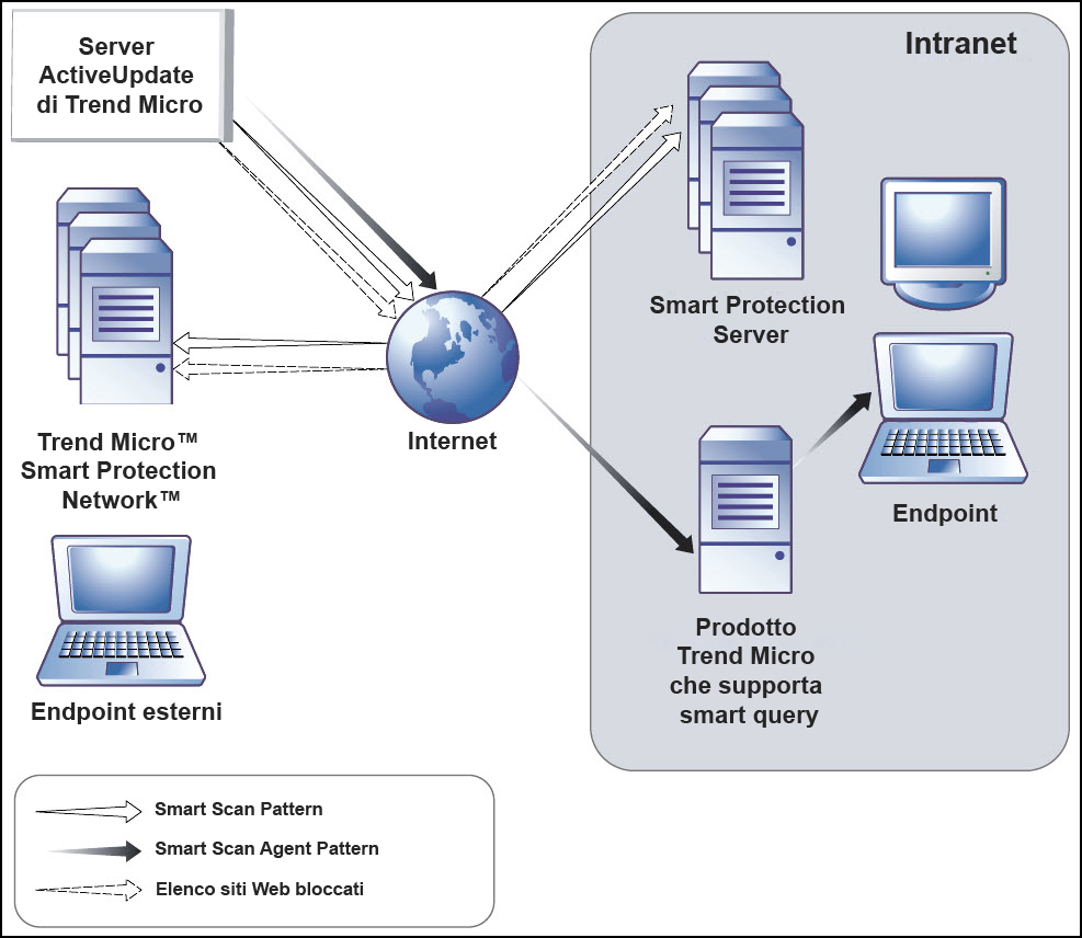 I dispositivi della Intranet scaricano i file Smart Scan Agent Pattern dai prodotti Trend Micro che supportano i computer Smart Protection Server. I dispositivi esterni sono dispositivi situati al di fuori della Intranet e non sono in grado di connettersi ai computer Smart Protection Server o ai prodotti Trend Micro che supportano i computer Smart Protection Server.