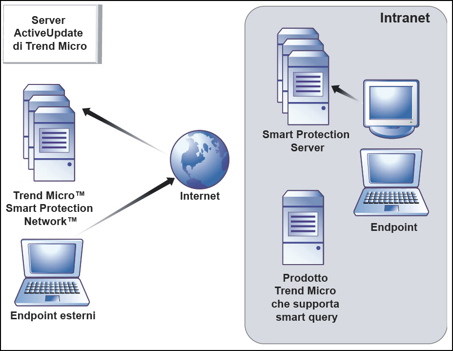 I dispositivi attualmente presenti nella Intranet utilizzano i computer Smart Protection Server per le query. Gli dispositivo attualmente non presenti nella Intranet non possono connettersi a Trend Micro Smart Protection Network per tale operazione.