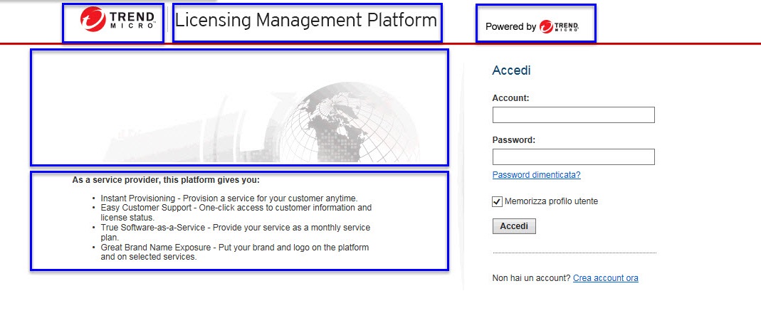 È possibile personalizzare l'aspetto e le informazioni visualizzati dai partner sulla console Web Licensing Management Platform. Nello schema seguente sono evidenziate le parti della schermata di accesso che è possibile personalizzare.