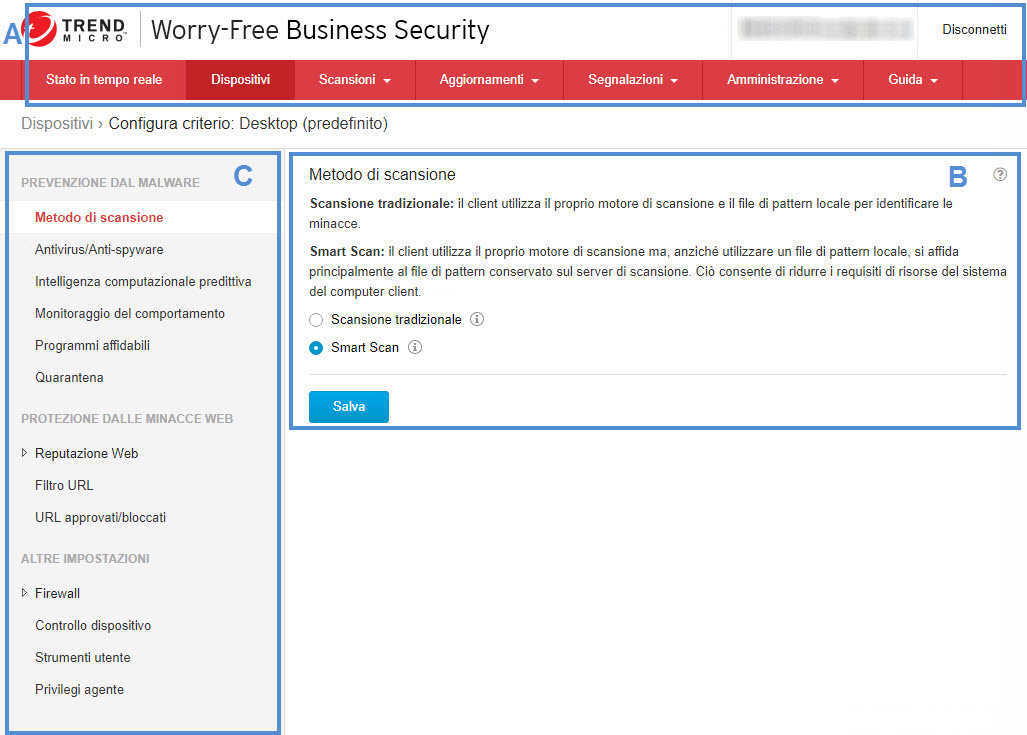 La barra laterale dei menu viene visualizzata quando si seleziona un gruppo di Security Agent nella schermata Dispositivi e si fa clic su Configura criterio. La barra laterale consente di configurare le impostazioni di sicurezza e le scansioni per i computer desktop e server che appartengono al gruppo. Se si seleziona un Messaging Security Agent nella schermata Dispositivi (solo Avanzate), è possibile utilizzare la barra laterale per configurare le impostazioni di sicurezza e le scansioni per i server Microsoft Exchange. |