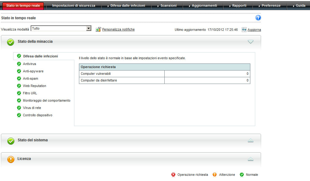 Questa sezione contiene informazioni sullo stato della licenza del prodotto, in particolare per quanto riguarda la scadenza.
