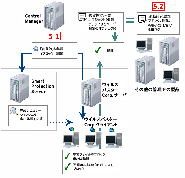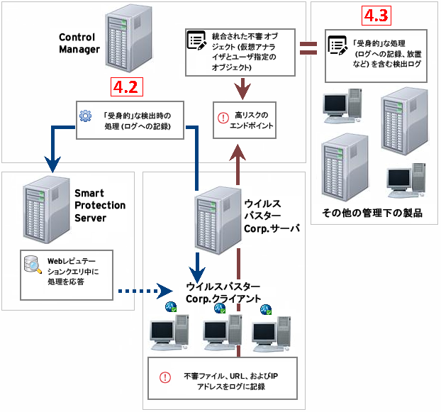 ウイルスバスター Corp.クライアントおよびその他の管理下の製品が、不審オブジェクトに対して「能動的」な検出時の処理を実行します。