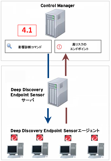 4.1. 影響診断 の仮想アナライザで検出された不審オブジェクトのリストの中から、影響診断を実行して高リスクのオブジェクトを特定します。 影響診断を実行するには、Deep Discovery Endpoint Sensorが必要です。必要な最小バージョンは1.5です。 この製品では、診断を実行するだけで、高リスクのエンドポイントに対する処理は実行されません。 |