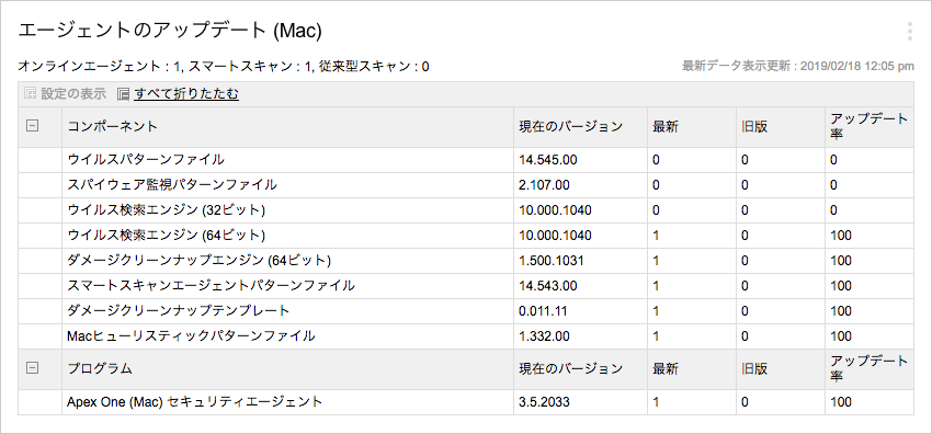 エージェントのアップデート (Mac) ウィジェットには、エンドポイントをセキュリティリスクから保護するコンポーネントとプログラムが表示されます。