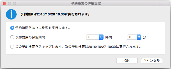 Apex One (Mac) 管理者によって権限が付与されている場合、[予約検索の詳細設定] 画面で予約検索を許可、延期、またはスキップできます。