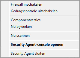 Er zijn snelkoppelingen voor veelgebruikte taken beschikbaar. Deze worden zichtbaar wanneer gebruikers met de rechtermuisknop op het Security Agent-pictogram op de taakbalk klikken.