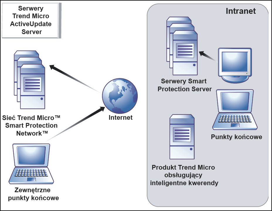 Punkty końcowe podłączone do sieci intranet korzystają z komputerów z programem Smart Protection Server do wykonywania zapytań. Natomiast punkty końcowe, które nie są w sieci intranet, mogą łączyć się z siecią Trend Micro Smart Protection Network do wykonywania kwerend.