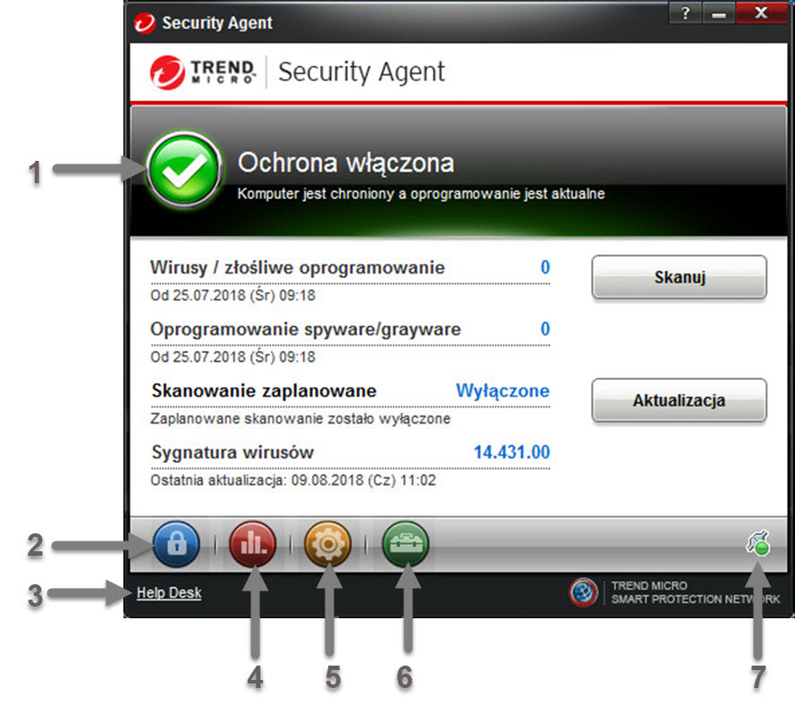 Wyświetlanie informacji dotyczących bieżącego stanu programu Security Agent oraz chronionego przez ten program urządzenia typu punkt końcowy. |