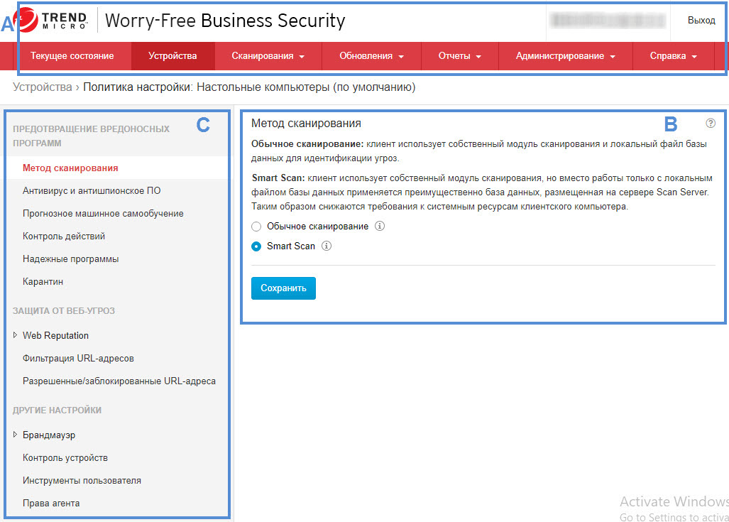 Если выбрать группу агента Security Agent в окне Устройства и нажать кнопку Политика настройки, отобразится боковое меню. Оно позволяет настроить параметры безопасности и режимов сканирования для настольных ПК и серверов, которые принадлежат к этой группе. Если в окне Устройства выбрать Messaging Security Agent (только Advanced), в боковом меню можно настроить параметры безопасности и режимы сканирования для серверов Microsoft Exchange Server. |