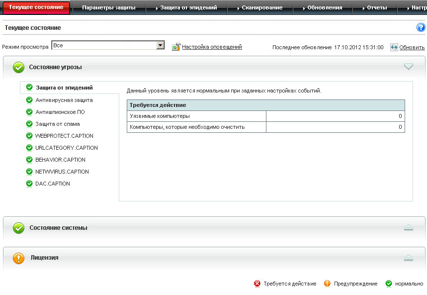 Частота обновления информации для каждого раздела в окне Текущее состояние разная: от 1 до 10 минут. Чтобы обновить информацию в окне, нажмите в браузере кнопку Обновить.