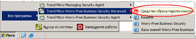 Если вы забыли свой пароль, можно воспользоваться средством сброса пароля консоли. Для этого на сервере Security Server выберите соответствующий пункт в папке Trend Micro Worry-Free Business Security в меню Windows «Пуск». ![]() |