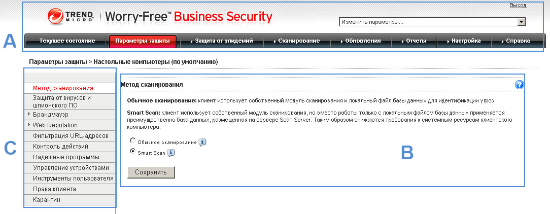 Если выбрать группу агента Security Agent в окне Параметры защиты и нажать кнопку Настроить параметры, отобразится боковое меню. Оно позволяет настроить параметры безопасности и режимов сканирования для настольных ПК и серверов, которые принадлежат к этой группе. Если в окне «Параметры защиты» выбрать Messaging Security Agent (только Advanced), боковое меню можно использовать для настройки параметров безопасности и режимов сканирования сервера Exchange. |