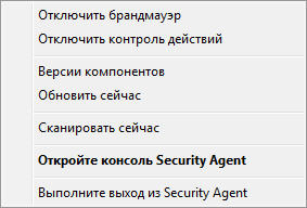 Ярлыки для часто выполняемых задач, доступных при щелчке по значку Security Agent правой кнопкой мыши на панели задач Windows.