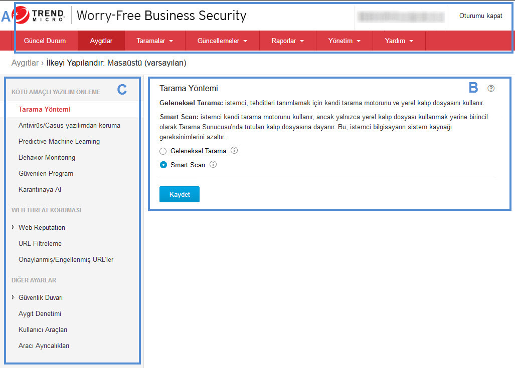 Web konsolunun üst kısmında ana menü bulunmaktadır. Ayrıca oturumunuzu sonlandırmanıza imkan sağlamak için Oturum kapat bağlantısı da sağlanmaktadır. |