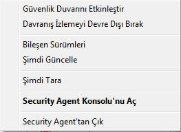 Windows Görev Çubuğu'ndaki Security Agent simgesine sağ tıklandığında kullanıcıların sıklıkla gerçekleştirdiği görevlerin kısayolları kullanılabilir.