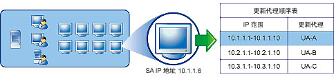 每个安全客户端都会加载一个“更新代理顺序表”副本,以确定合适的更新源。更新代理在“更新代理顺序表”中的顺序,最初由其在 Web 控制台上添加为“备用更新源”时的顺序确定。每个安全客户端都会表中的第一项开始查起,一次查看一项,直到确定其更新源。