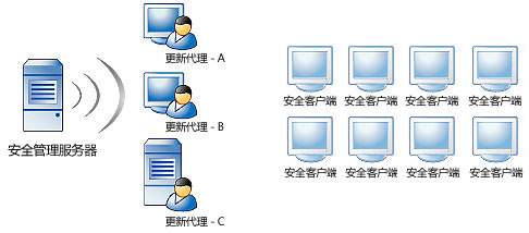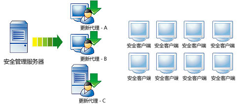 更新代理是安全客户端,它们可以从安全管理服务器或 ActiveUpdate 服务器接收更新的组件,并将它们部署到其他安全客户端。