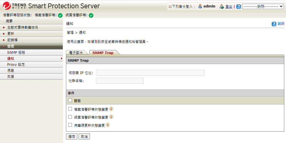 設定「簡易網路管理通訊協定」(SNMP) 通知設定,以便在服務或更新的狀態變更時,透過 SNMP Trap 通知管理員。