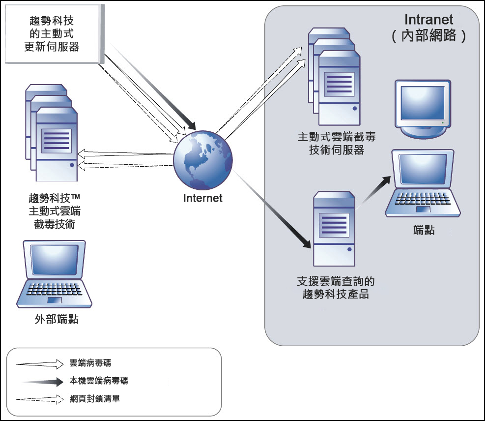 位於內部網路中的端點則會從支援主動式雲端截毒技術伺服器電腦的趨勢科技產品下載本機雲端病毒碼檔案。外部端點位於內部網路之外,並且無法與主動式雲端截毒技術伺服器電腦或支援主動式雲端截毒技術伺服器電腦的趨勢科技產品連線。