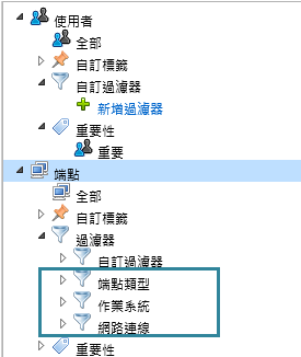 依預設,「端點」樹狀結構會根據組織中典型的端點分組來提供預設過濾器。