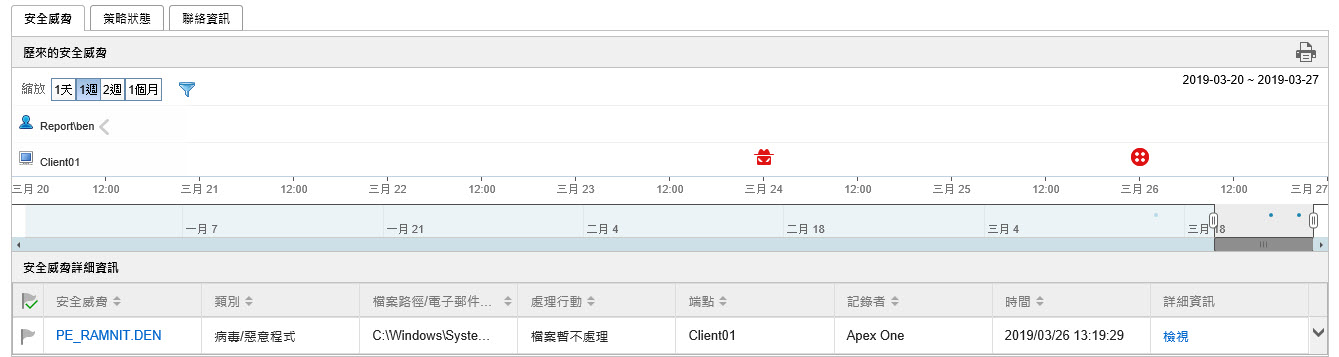 歷來的安全威脅:根據偵測時間以及偵測是否發生於指派的端點或使用者帳號,提供用圖表示的安全威脅資訊。