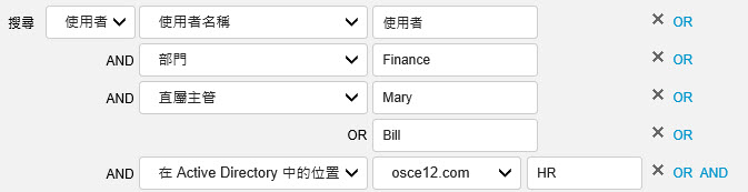 若要過濾 Active Directory 網域 "HR" 中財務部門裡 "Mary" 或 "Bill" 下屬中姓名包含 "ja" 的所有使用者,請指定下列條件: