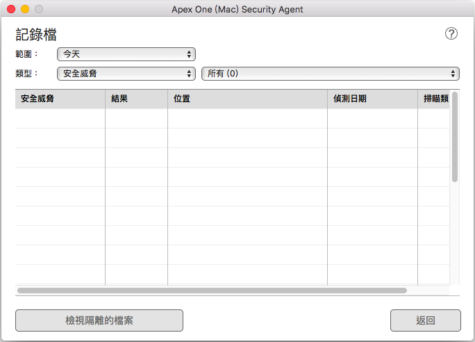 「記錄檔」畫面可讓您檢視和管理記錄檔項目。您還可以檢視已被 Security Agent 隔離的中毒檔案。