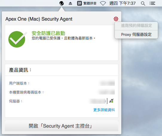 將 Security Agent 設定為透過 Proxy 伺服器來連線至父系伺服器。 請參閱設定 Proxy 設定。 註: