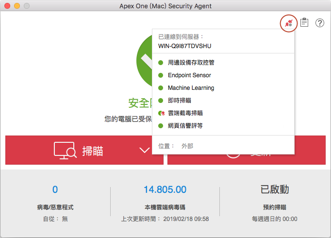 已連線到 Apex One (Mac) 伺服器 |