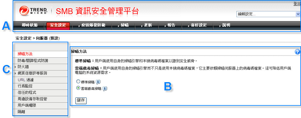 當您從「安全設定」畫面選擇 Messaging Security Agent 時(僅限 Advanced 版),可以使用側邊欄設定安全設定,並掃瞄 Microsoft Exchange Server。
